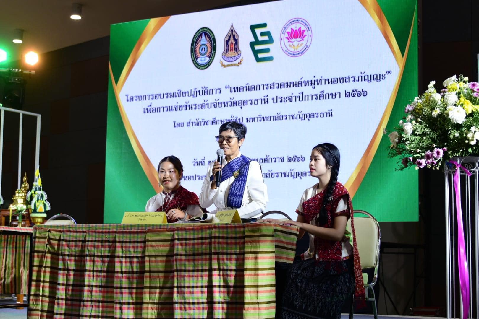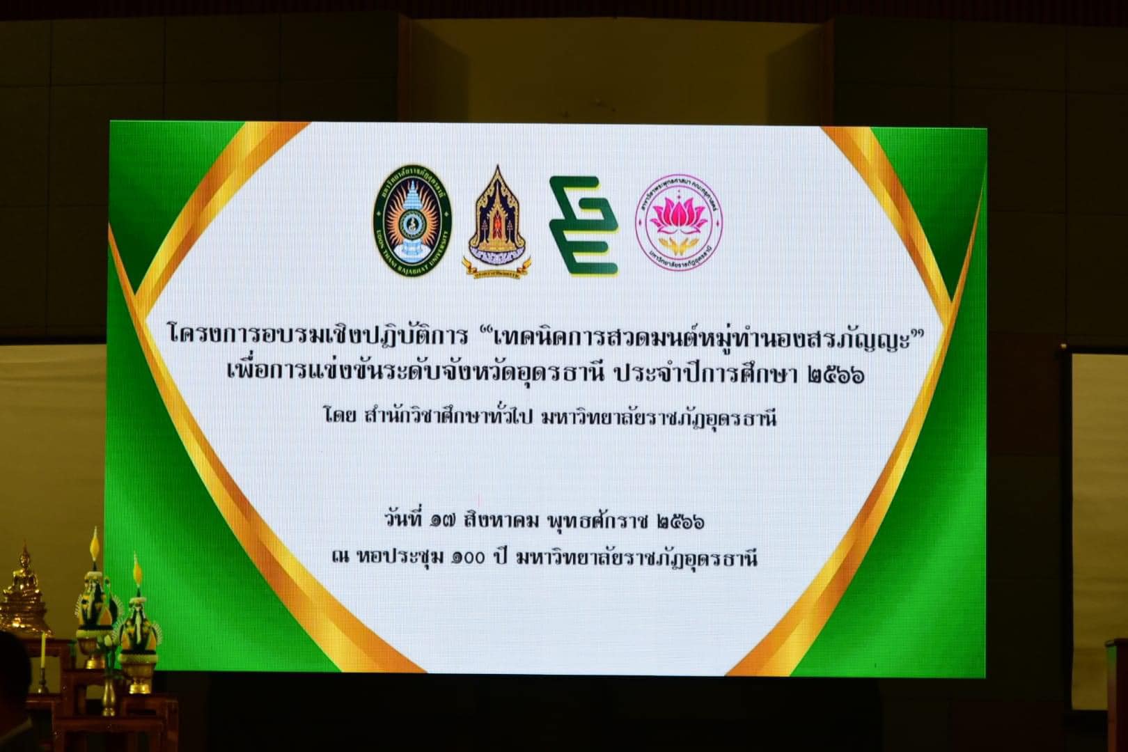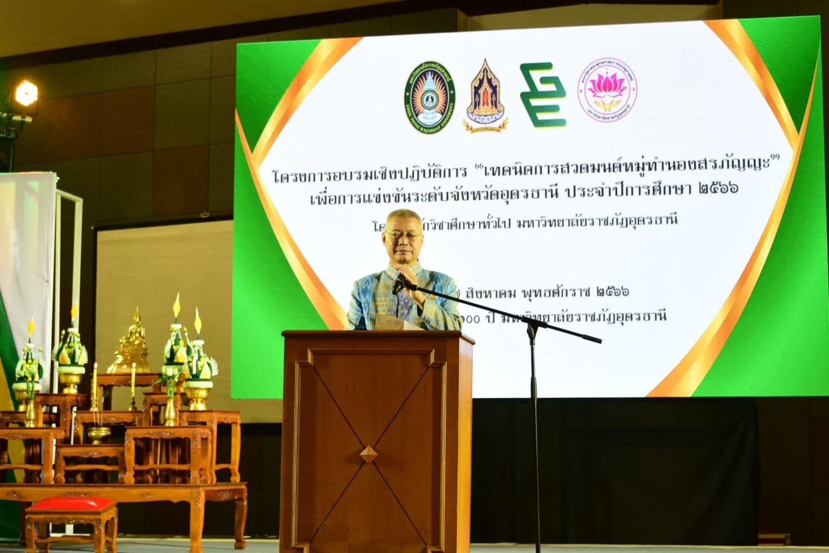 วันที่ 17 สิงหาคม 2566 เวลา 9.30 น. ณ หอประชุมใหญ่ มหาวิทยาลัยราชภัฏอุดรธานี สามพร้าว ผศ.หัสดิน แก้ววิชิต รองผู้อำนวยการสำนักวิชาศึกษาทั่วไป เป็นตัวเเทนผู้อำนวยการสำนักวิชาศึกษาทั่วไป กล่าวรายงานต่อนายธีทัต พิมพา วัฒนธรรมจังหวัดอุดรธานี ที่ให้เกียรติมาเป็นประธานเปิดโครงการอบรมเชิงปฏิบัติการ เรื่องเทคนิคการสวดมนต์หมู่ทำนองสรภัญญะเพื่อการเเข่งขันในระดับจังหวัดอุดรธานี ซึ่งเป็นโครงการที่ฝ่ายส่งเสริมศิลปะและวัฒนธรรม สำนักวิชาศึกษาทั่วไป ร่วมกับ สาขาวิชาพระพุทธศาสนา คณะครุศาสตร์ มหาวิทยาลัยราชภัฏอุดรธานี ได้เล็งเห็นความสำคัญของพันธกิจบริการวิชาการให้แก่สังคม มีวัตถุประสงค์เพื่อสร้างทักษะการสวดมนต์หมู่ทำนองสรภัญญะ อันจะนำไปสู่กระบวนการเรียนรู้ทางเทคนิคในการสวดมนต์เพื่อการเเข่งขันในระดับจังหวัดอุดรธานี