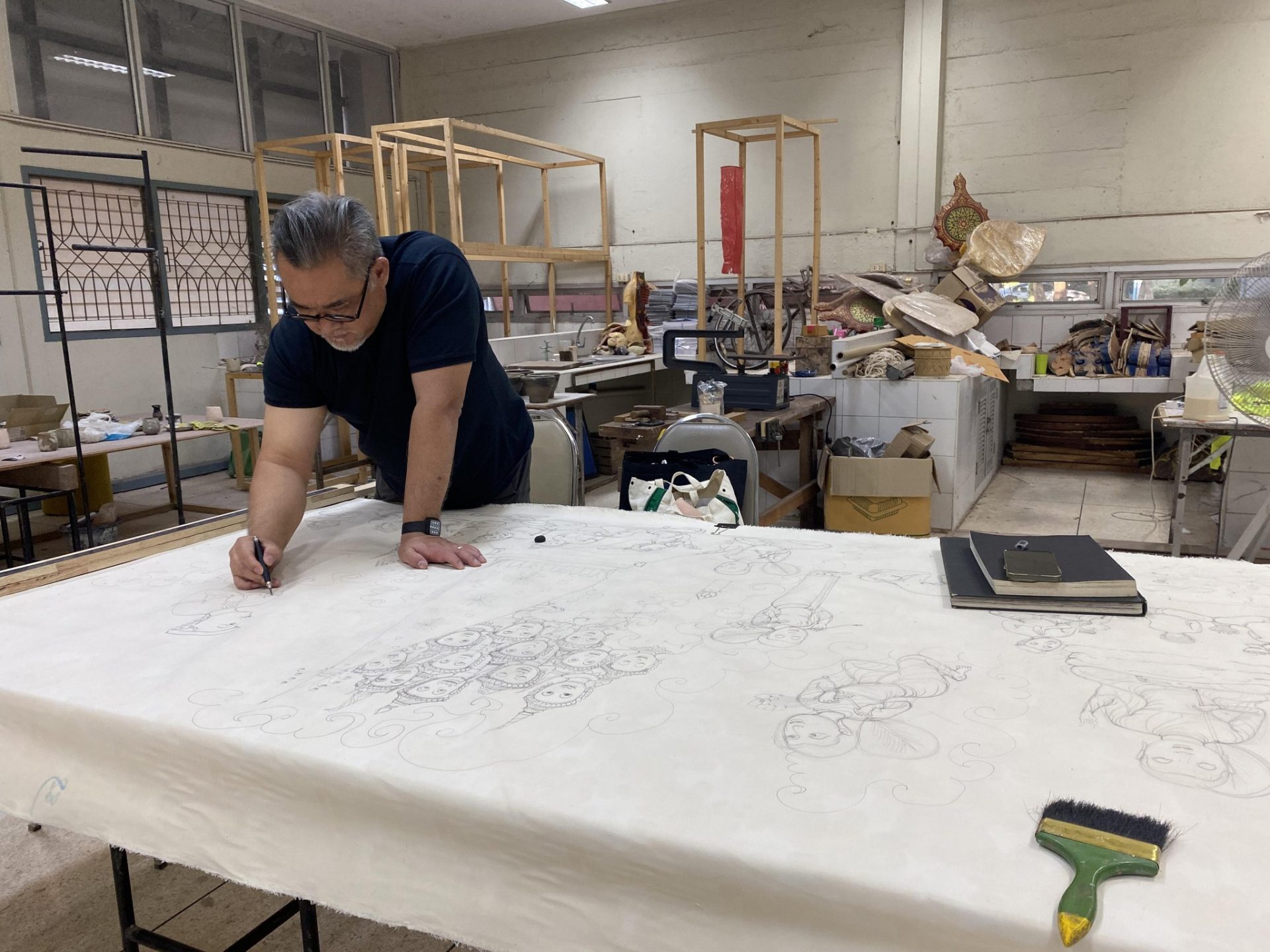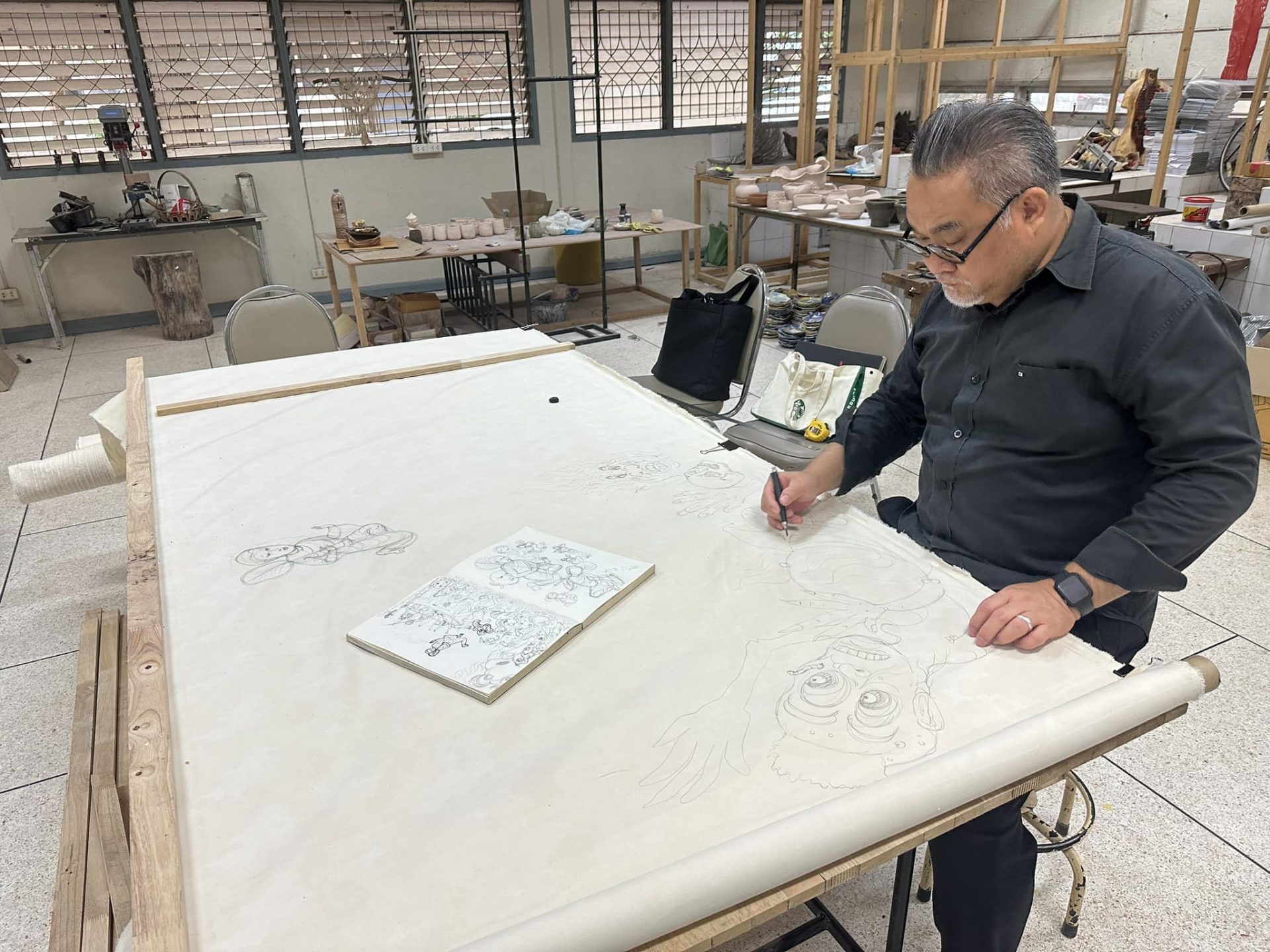 รศ.ดร.ชวลิต อธิปัตยกุล อาจารย์สำนักวิชาศึกษาทั่วไป เขียนภาพบุญผะเหวด 30 เมตร เตรียมงานฮีต 12 คอง 14 วัดบ้านโนนกอก