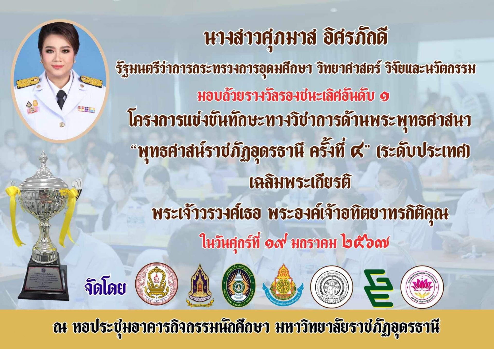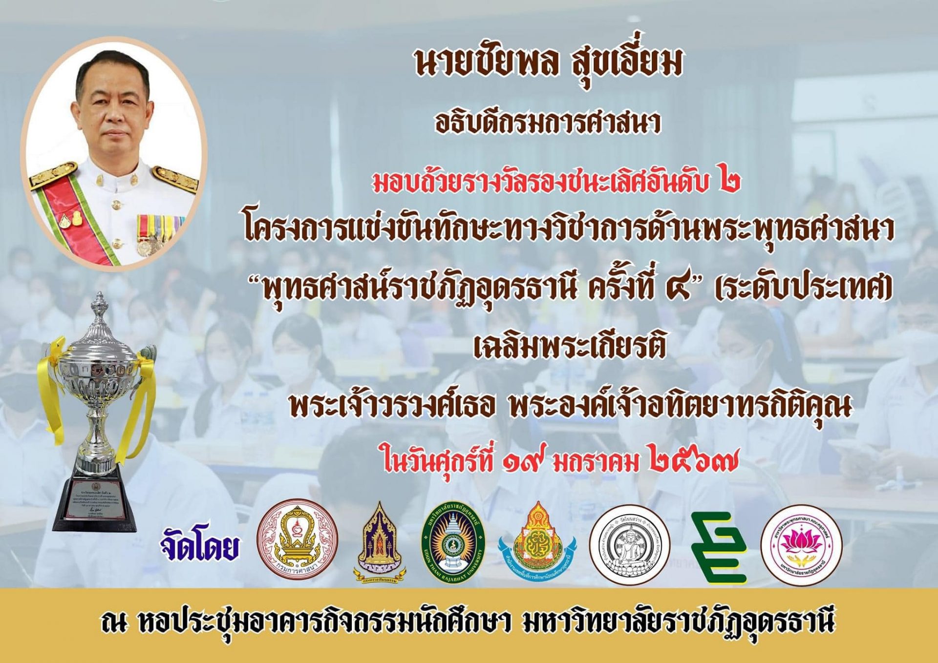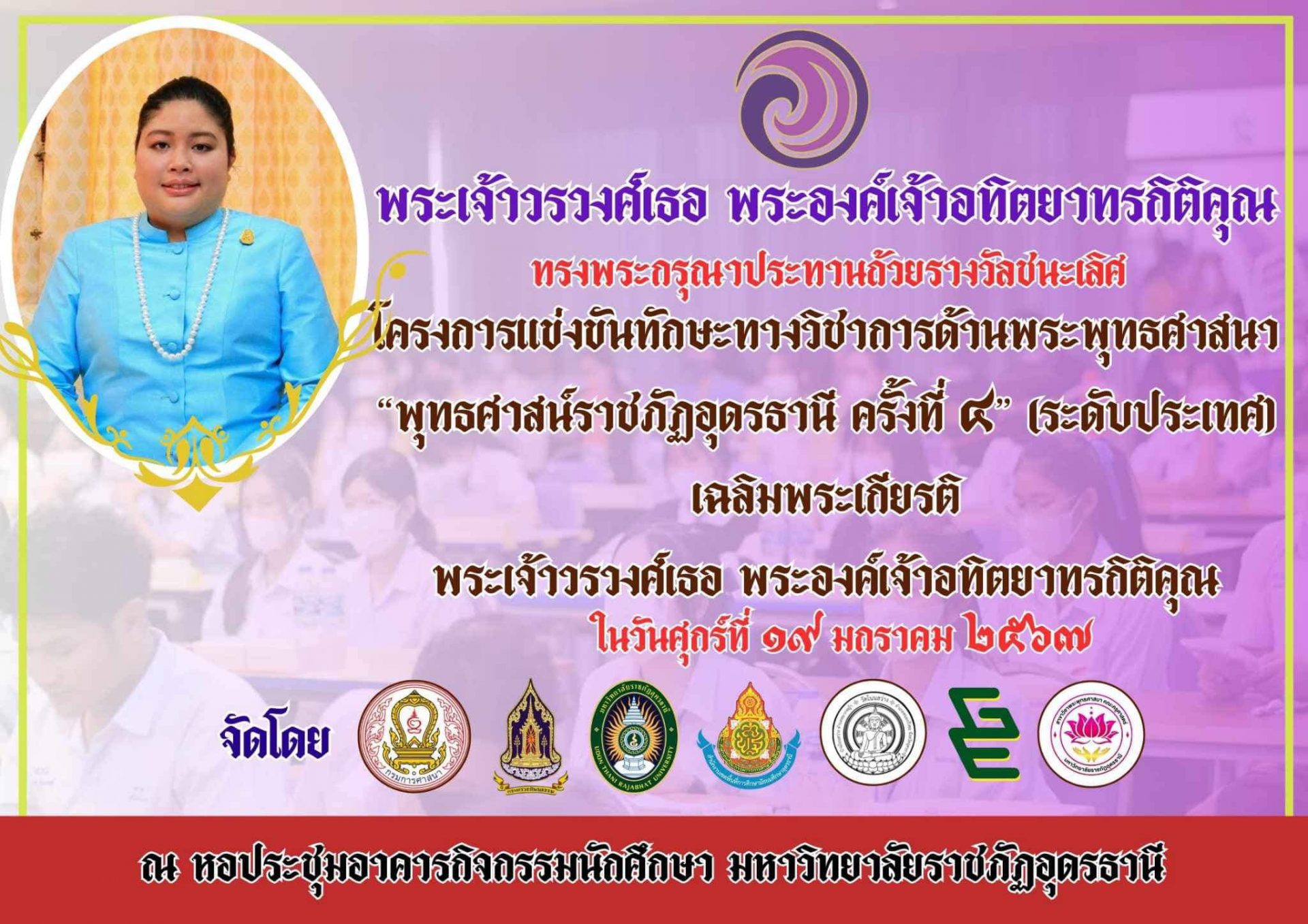 ฝ่ายส่งเสริมศิลปะและวัฒนธรรม สำนักวิชาศึกษาทั่วไป ร่วมกับสาขาวิชาพระพุทธศาสนา คณะครุศาสตร์ มหาวิทยาลัยราชภัฏอุดรธานี รวมทั้งภาคีเครือข่ายสำนักงานวัฒนธรรมจังหวัดอุดรธานี กรม ศาสนากระทรวงวัฒนธรรม สำนักงานเขตพื้นที่การศึกษามัธยมศึกษาอุดรธานี และวัดโนนสว่าง (ธ) อ.หนองวัวซอ จ.อุดรธานี จัดโครงการแข่งขันทักษะทางวิชาการด้านพระพุทธศาสนา “พุทธศาสน์ราชภัฏอุดรธานี ครั้งที่ 4” (ระดับประเทศ)