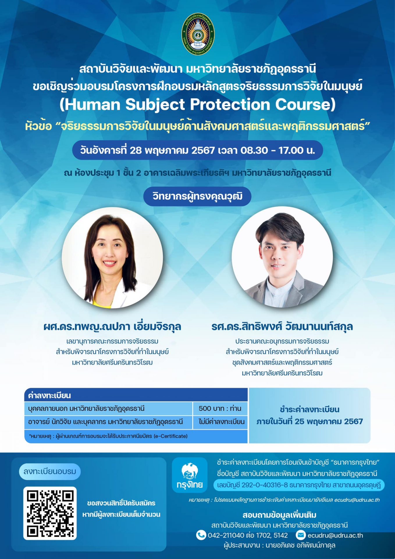 วันที่ 28 พฤษภาคม 2567 ณ ห้องประชุม 1 อาคารเฉลิมพระเกียรติฯ ผศ.ดร.คณิศรา ธัญสุนทรสกุล อธิการบดี กล่าวเปิด โครงการอบรมจริยธรรมการวิจัยในมนุษย์ (Human Subject Protection Course) เรื่อง “จริยธรรมการวิจัยในมนุษย์ด้านสังคมศาสตร์และพฤติกรรมศาสตร์” สถาบันวิจัยและพัฒนา มหาวิทยาลัยราชภัฏอุดรธานี จัดโครงการดังกล่าวขึ้นโดยมีวัตถุประสงค์เพื่อสร้างความเข้าใจในหลักจริยธรรมและแนวทางปฏิบัติสามารถนำไปประยุกต์กับการวิจัยทางคลินิก การวิจัยทางระบาดวิทยา การวิจัยทาง สังคมศาสตร์ พฤติกรรมศาสตร์ และสาขาวิชาอื่น ๆ ได้อย่างกว้างขวาง และยังเป็นประโยชน์ระหว่างผู้เกี่ยวข้องการวิจัยในการปกป้องสิทธิ ความปลอดภัย ความเป็นอยู่ที่ดีของผู้เข้าร่วมการวิจัย และได้ข้อมูลที่เชื่อถือได้ทางวิทยาศาสตร์ อันจะก่อคุณค่าทางวิทยาศาสตร์และสังคมต่อไป