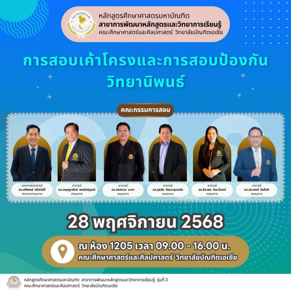วันศุกร์ ที่ 28 พฤศจิกายน 2568 เวลา 09.00 – 17.00 น. รองศาสตราจารย์ ดร.ศศิพงษ์ ศรีสวัสดิ์ อาจารย์สำนักวิชาศึกษาทั่วไป มหาวิทยาลัยราชภัฏอุดรธานีเป็นประธานกรรมการ การสอบป้องกันวิทยานิพนธ์ (5 บท) และสอบเค้าโครงการศึกษาค้นคว้าอิสระ(3 บท) ของนักศึกษาหลักสูตรศึกษาศาสตรมหาบัณฑิต สาขาวิชาการพัฒนาหลักสูตรและวิทยาการเรียนรู้ ณ ห้อง 1205 วิทยาลัยบัณฑิตเอเซีย อำเภอเมือง จังหวัดขอนแก่น 2 Tags: สอบเค้าโครง