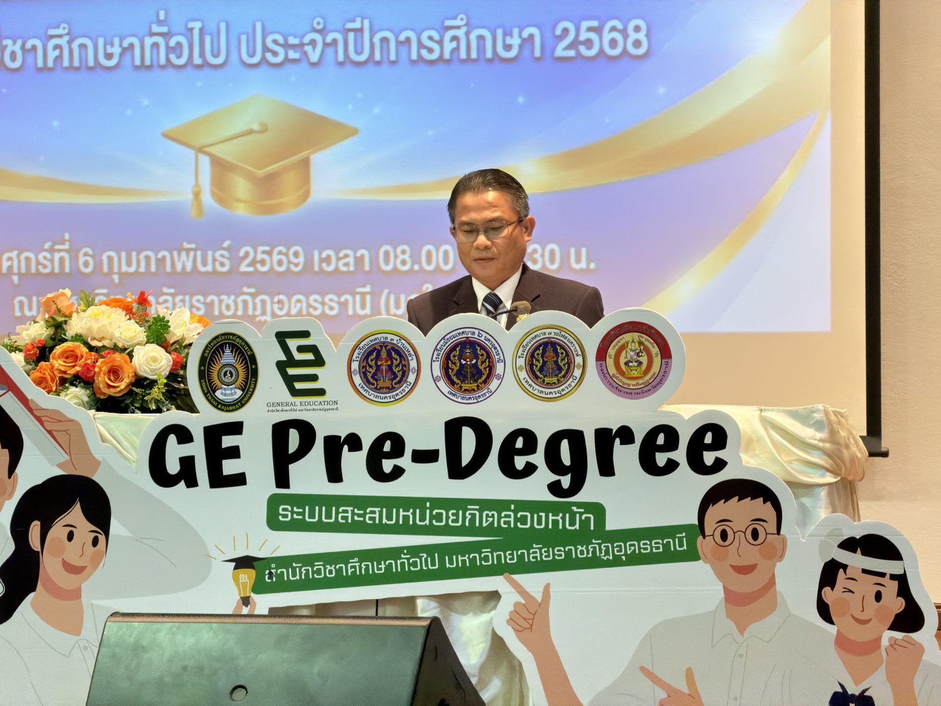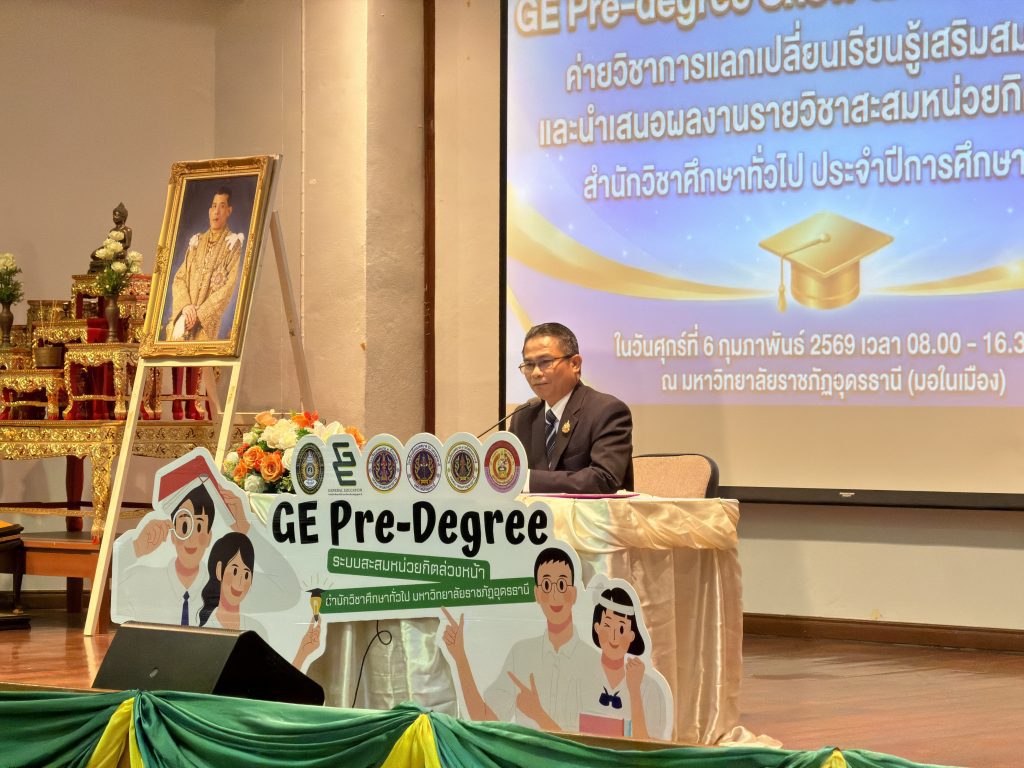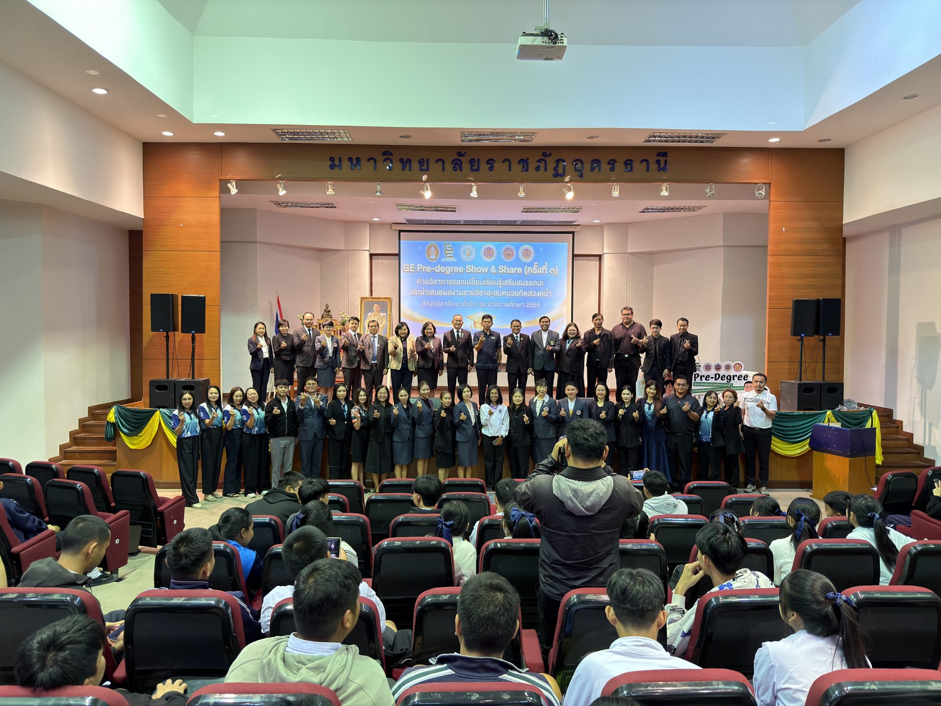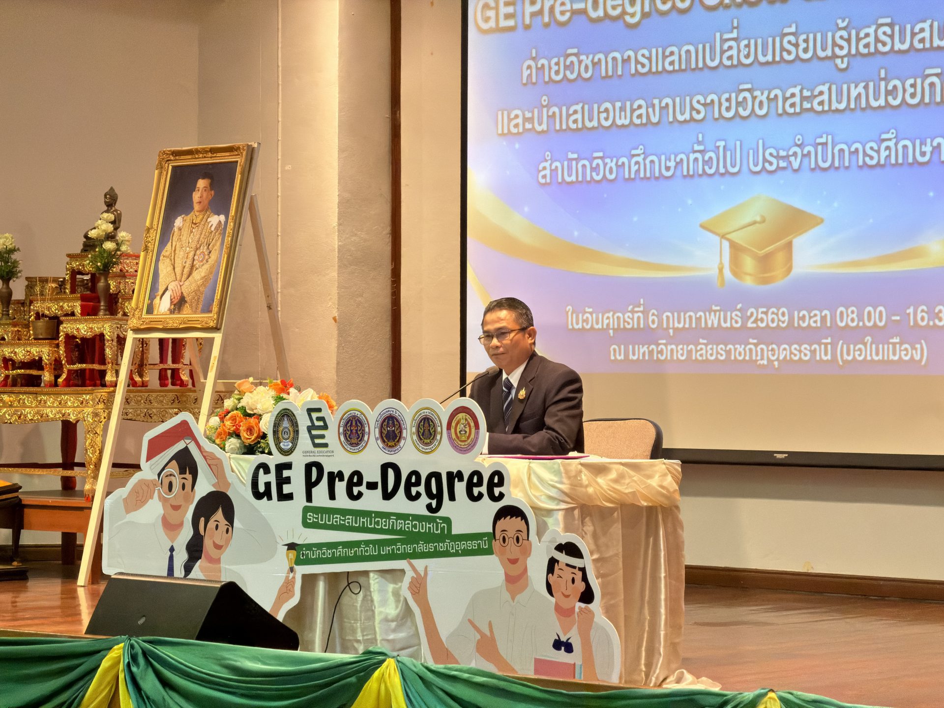 วันที่ 6 กุมภาพันธ์ 2569 ณ ห้องประชุม 1 อาคารเฉลิมพระเกียรติ มหาวิทยาลัยราชภัฏอุดรธานี สำนักวิชาศึกษาทั่วไป ร่วมกับ สำนักงานศึกษาธิการจังหวัดอุดรธานี และเทศบาลนครอุดรธานี จัดโครงการ GE Pre-Degree Show & Share ครั้งที่ 3 “ค่ายวิชาการแลกเปลี่ยนเรียนรู้ เสริมสมรรถนะและนำเสนอผลงานรายวิชาสะสมหน่วยกิตล่วงหน้า (Pre-Degree) ประจำปีการศึกษา 2568” เพื่อขับเคลื่อนการจัดการศึกษาเชิงบูรณาการตามแนวคิด ระบบธนาคารสะสมหน่วยกิต (Credit Bank) และนโยบาย การเรียนรู้ตลอดชีวิต (Lifelong Learning)