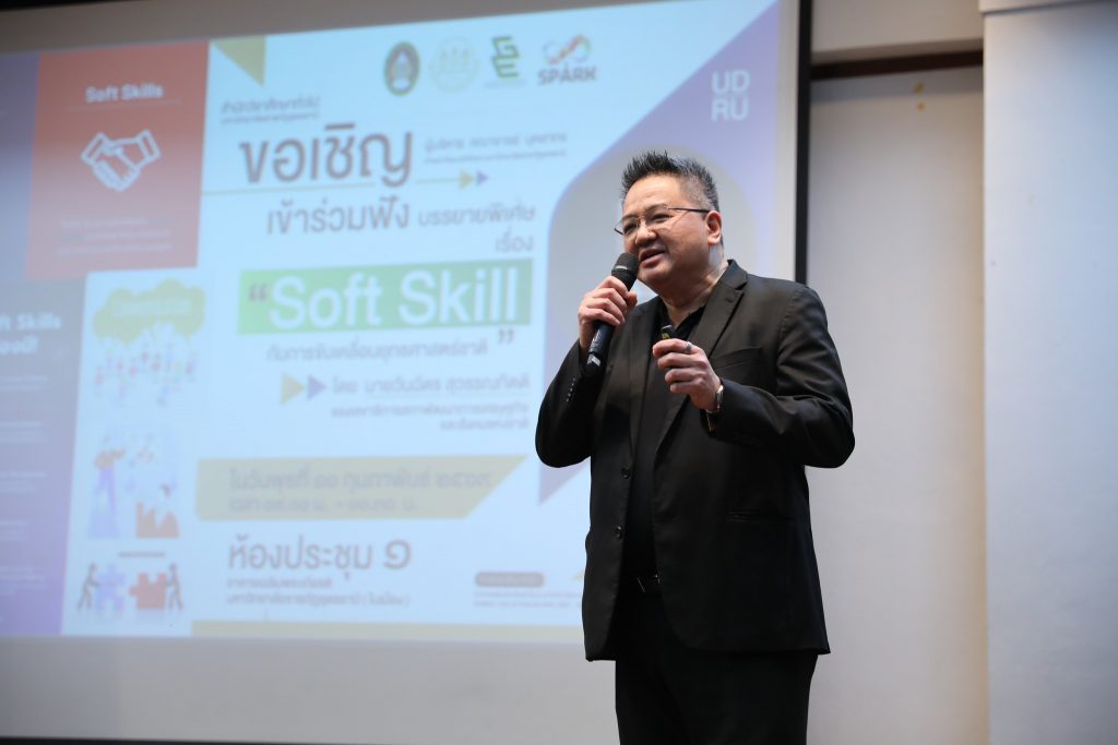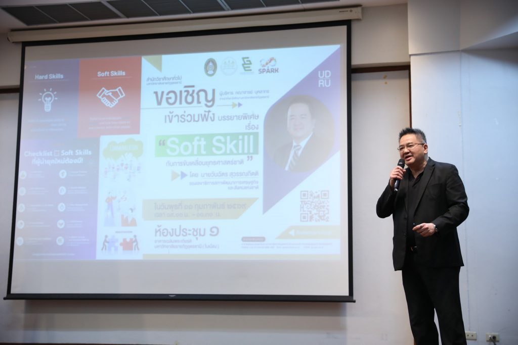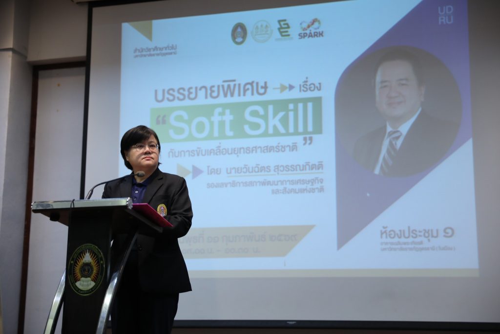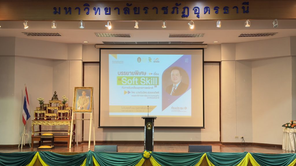 สำนักวิชาศึกษาทั่วไป มรภ.อุดรธานี จัดบรรยายพิเศษ “Soft Skill กับการขับเคลื่อนยุทธศาสตร์ชาติ” เสริมศักยภาพนักศึกษา วันที่ 11 กุมภาพันธ์ พ.ศ. 2569 ณ ห้องประชุม 1 อาคารเฉลิมพระเกียรติฯ สำนักวิชาศึกษาทั่วไป มหาวิทยาลัยราชภัฏอุดรธานี จัดการบรรยายพิเศษ เรื่อง “Soft Skill กับการขับเคลื่อนยุทธศาสตร์ชาติ” โดยได้รับเกียรติจาก นายวันฉัตร สุวรรณกิตติ รองเลขาธิการสภาพัฒนาการเศรษฐกิจและสังคมแห่งชาติ (สศช.) เป็นวิทยากรบรรยาย โดยมี ผู้ช่วยศาสตราจารย์ ดร.คณิศรา ธัญสุนทรสกุล รักษาราชการแทนอธิการบดีมหาวิทยาลัยราชภัฏอุดรธานี เป็นประธานกล่าวเปิดโครงการ การบรรยายพิเศษครั้งนี้จัดขึ้นเพื่อเสริมสร้างความรู้ความเข้าใจเกี่ยวกับบทบาทของ ทักษะ Soft Skill ในการพัฒนาทรัพยากรมนุษย์ ซึ่งถือเป็นกลไกสำคัญในการขับเคลื่อน ยุทธศาสตร์ชาติ 20 ปี โดยเฉพาะยุทธศาสตร์ด้านการพัฒนาและเสริมสร้างศักยภาพทรัพยากรมนุษย์ ให้มีสมรรถนะสอดคล้องกับความต้องการของประเทศในศตวรรษที่ 21 ทั้งนี้ การพัฒนา Soft Skill ยังมีส่วนสำคัญในการเตรียมความพร้อมผู้เรียนระดับอุดมศึกษาให้สามารถปรับตัวเข้าสู่ตลาดแรงงาน และรองรับการเปลี่ยนแปลงของโครงสร้างเศรษฐกิจและสังคม ภายใต้นโยบาย Thailand 4.0 ที่มุ่งเน้นเศรษฐกิจฐานนวัตกรรม การเรียนรู้ตลอดชีวิต และการพัฒนากำลังคนให้มีความคิดสร้างสรรค์ ทักษะการสื่อสาร การทำงานเป็นทีม และคุณธรรมจริยธรรม อันจะนำไปสู่การพัฒนาประเทศอย่างมั่นคง มั่งคั่ง และยั่งยืน ภายหลังพิธีเปิดโครงการ ประธานในพิธีและคณะผู้บริหารได้ร่วมเยี่ยมชมกิจกรรม “โครงการบอร์ดเกมส์เพื่อพัฒนาทักษะชีวิต : เล่นเพลิน Learn Soft Skills” ณ ศูนย์จุดประกายทักษะชีวิต (SPARK Center) ซึ่งเป็นกิจกรรมที่ส่งเสริมการเรียนรู้ผ่านกระบวนการเล่นและการมีส่วนร่วมของผู้เรียน เพื่อพัฒนาทักษะชีวิตและ Soft Skill อย่างสร้างสรรค์ 1 Tags: Soft Skillบรรยายพิเศษยุทธศาสตร์ชาติ
