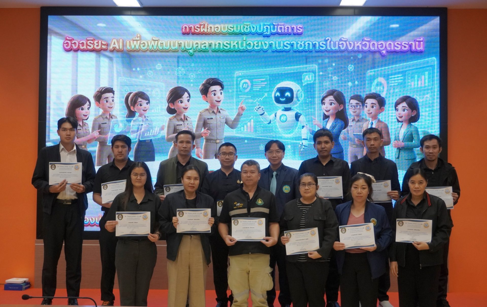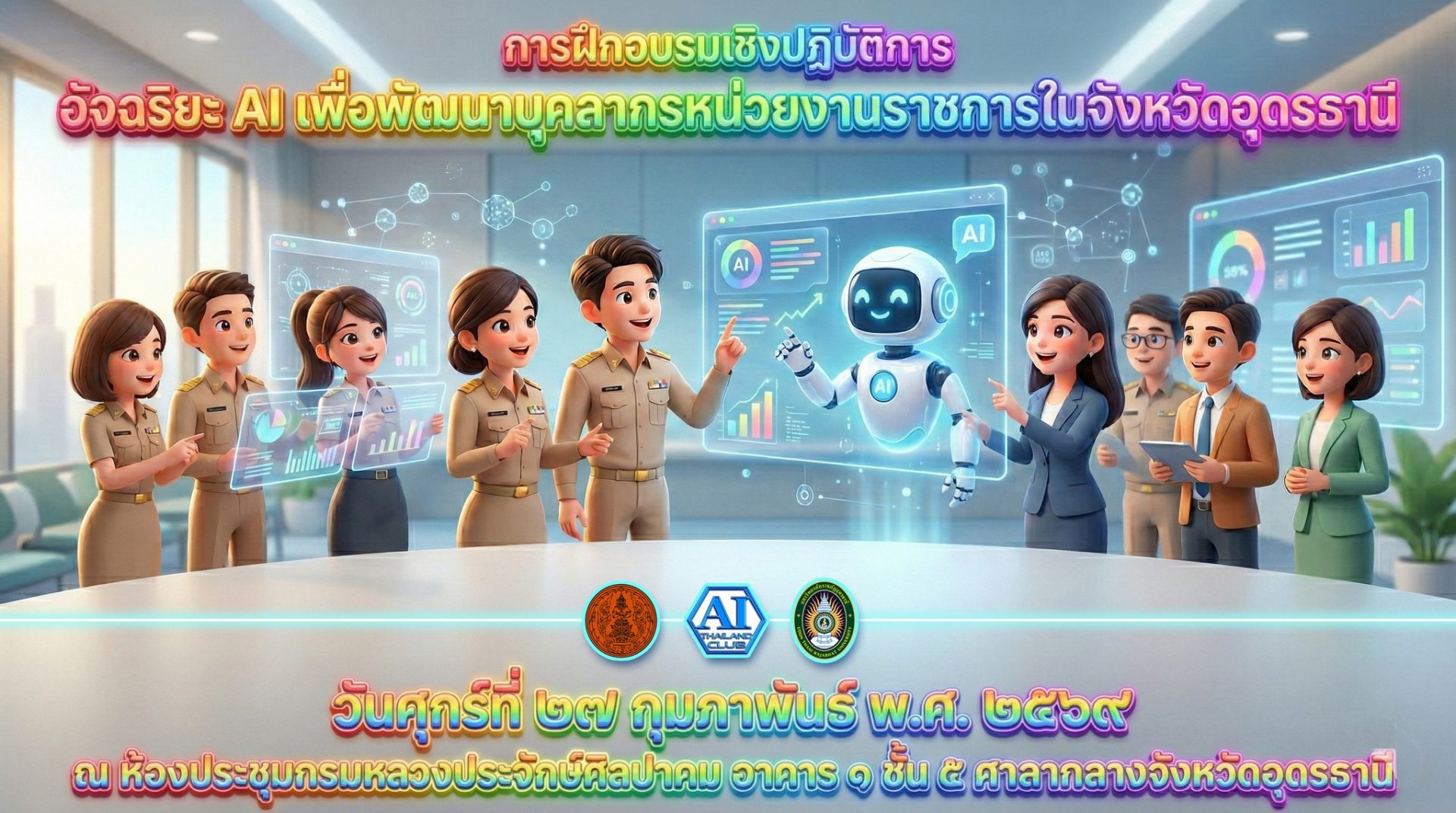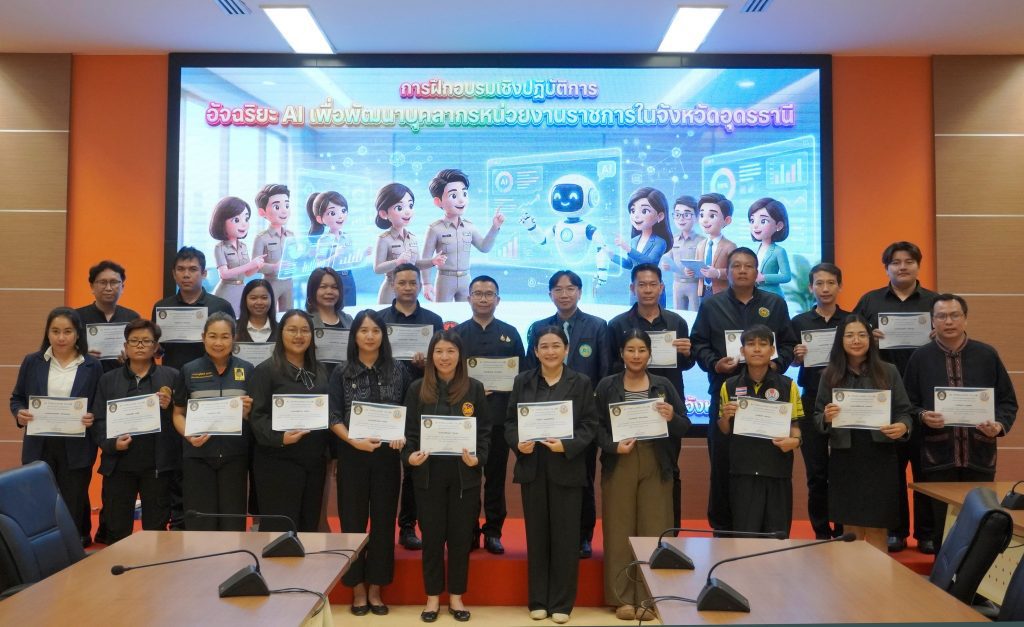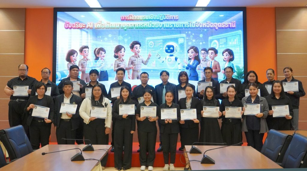 27 กุมภาพันธ์ พ.ศ. 2569 จังหวัดอุดรธานีจัดกิจกรรมฝีกอบรมเชิงปฏิบัติการ เรื่อง อัจฉริยะ AI เพื่อพัฒนาบุคลากรหน่วยงานราชการในจังหวัดอุดรธานี   ณ ห้องประชุมกรมหลวงประจักษ์ศิลปาคม อาคาร 1 ชั้น 5 ศาลากลางจังหวัดอุดรธานี โดยมีวัตถุประสงค์เพื่อเสริมสร้างความรู้ความเข้าใจเกี่ยวกับเทคโนโลยีปัญญาประดิษฐ์ (AI) และบทบาทของ AI ในการพัฒนาภาครัฐสู่ยุคดิจิทัล