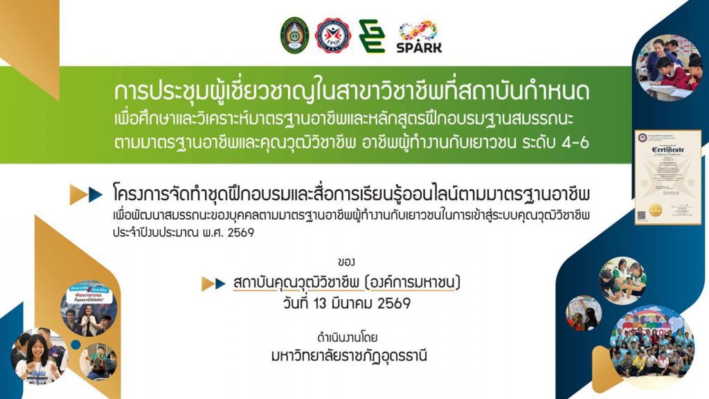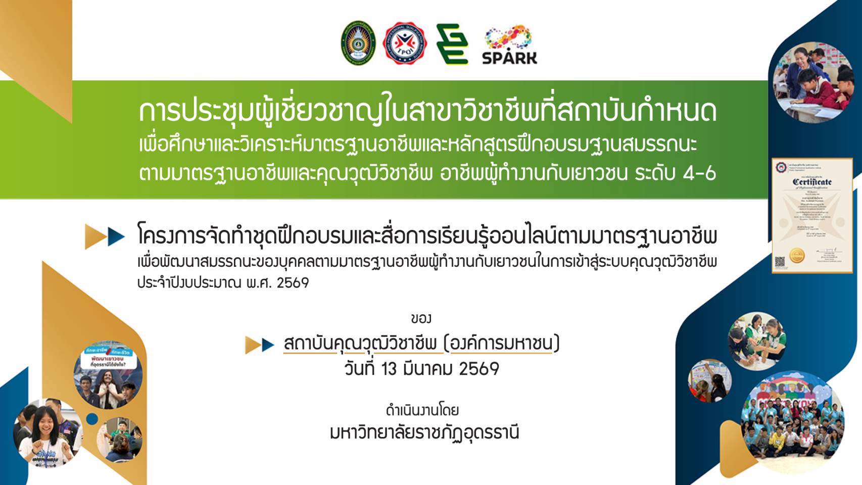 วันที่ 13 มีนาคม 2569 สำนักวิชาศึกษาทั่วไป มหาวิทยาลัยราชภัฏอุดรธานี จัดประชุมผู้เชี่ยวชาญเพื่อศึกษาและวิเคราะห์มาตรฐานอาชีพและหลักสูตรฝึกอบรมฐานสมรรถนะตามมาตรฐานอาชีพและคุณวุฒิวิชาชีพ เพื่อใช้เป็นแนวทางในการออกแบบและจัดทำสื่อการเรียนรู้แบบผสมผสาน (Multimedia) สำหรับหลักสูตรฝึกอบรมตามมาตรฐานสมรรถนะ สาขาวิชาชีพธุรกิจบริการ สาขางานบริการด้านเยาวชน อาชีพผู้ทำงานกับเยาวชน ระดับคุณวุฒิวิชาชีพ 4–6 การประชุมครั้งนี้ดำเนินการภายใต้ โครงการจัดทำชุดฝึกอบรมและสื่อการเรียนรู้ออนไลน์ตามมาตรฐานอาชีพ เพื่อพัฒนาสมรรถนะของบุคคลตามมาตรฐานอาชีพผู้ทำงานกับเยาวชนในการเข้าสู่ระบบคุณวุฒิวิชาชีพ ประจำปีงบประมาณ พ.ศ. 2569 โดยเป็นความร่วมมือระหว่างมหาวิทยาลัยราชภัฏอุดรธานี และสถาบันคุณวุฒิวิชาชีพ (องค์การมหาชน) ในการนี้ ผศ.วรวัฒน์ ทิพจ้อย ผู้อำนวยการสำนักวิชาศึกษาทั่วไป ในฐานะผู้จัดการโครงการ เป็นประธานดำเนินการประชุมร่วมกับคณะทำงานจากสำนักวิชาศึกษาทั่วไป คณะมนุษยศาสตร์และสังคมศาสตร์ และคณะวิทยาการจัดการ มหาวิทยาลัยราชภัฏอุดรธานี พร้อมด้วยคณะผู้เชี่ยวชาญทั้งภายในและภายนอกมหาวิทยาลัย ได้แก่ องค์การยูนิเซฟ ประเทศไทย มหาวิทยาลัยหัวเฉียวเฉลิมพระเกียรติ มหาวิทยาลัยธรรมศาสตร์ และสถาบันยุวทัศน์แห่งประเทศไทย โดยมีผู้แทนจากสถาบันคุณวุฒิวิชาชีพ (องค์การมหาชน) เข้าร่วมสังเกตการณ์และให้ข้อมูลสนับสนุนตลอดการประชุม เพื่อให้การพัฒนาหลักสูตรฝึกอบรมและสื่อการเรียนรู้ออนไลน์เป็นไปตามมาตรฐานอาชีพ และสามารถนำไปใช้พัฒนาศักยภาพผู้ปฏิบัติงานด้านเยาวชนได้อย่างมีประสิทธิภาพ 1 Tags: ประชุมผู้เชี่ยวชาญสาขาวิชาชีพธุรกิจบริการผู้เชี่ยวชาญสคช.สถาบันคุณวุฒิวิชาชีพอาชีพผู้ทำงานกับเยาวชน