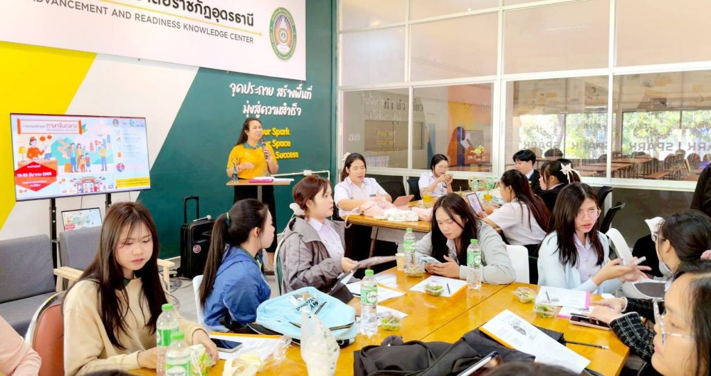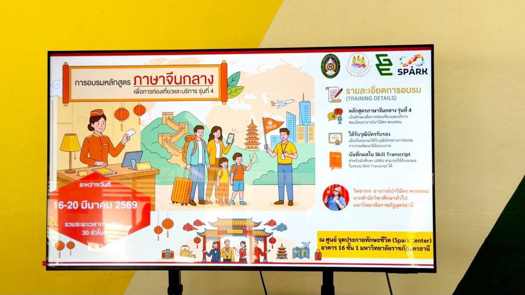 วันที่ 16 มีนาคม 2569 ณ ศูนย์จุดประกายทักษะชีวิต (SPARK Center) สำนักวิชาศึกษาทั่วไป ร่วมกับ สถาบันพัฒนาฝีมือแรงงาน 18 อุดรธานี จัดฝึกอบรม “หลักสูตรภาษาจีนกลางเพื่อการท่องเที่ยวและบริการ รุ่นที่ 4” โดยได้รับเกียรติจาก นางคำบง ยักไธสง ผู้อำนวยการกลุ่มงานพัฒนาฝีมือแรงงาน สถาบันพัฒนาฝีมือแรงงาน 18 อุดรธานี เป็นประธานในพิธีเปิด และ ผู้ช่วยศาสตราจารย์วรวัฒน์ ทิพจ้อย ผู้อำนวยการสำนักวิชาศึกษาทั่วไป กล่าวรายงานวัตถุประสงค์ของโครงการ การอบรมจัดขึ้นระหว่างวันที่ 16–20 มีนาคม 2569 รวมระยะเวลา 30 ชั่วโมง มีนักศึกษาและประชาชนทั่วไปเข้าร่วมอบรมจำนวน 30 คน โดยมีวัตถุประสงค์เพื่อพัฒนาทักษะการสื่อสารภาษาจีนสำหรับงานด้านการท่องเที่ยวและบริการ ซึ่งได้รับเกียรติจาก นางปาริฉัตร พรมสอน พร้อมด้วยคณาจารย์จากสำนักวิชาศึกษาทั่วไป เป็นวิทยากรถ่ายทอดความรู้และประสบการณ์แก่ผู้เข้าร่วมอบรม ทั้งนี้ ผู้ผ่านการอบรมจะได้รับวุฒิบัตรจากกรมพัฒนาฝีมือแรงงาน กระทรวงแรงงาน และนักศึกษาสามารถนำผลการอบรมไปใช้รับรองทักษะในระบบ Skill Transcript ของมหาวิทยาลัยได้อีกด้วย 1 Tags: รุ่นที่ 4สถาบันพัฒนาฝีมือแรงงาน 18 อุดรธานีหลักสูตรภาษาจีนกลางเพื่อการท่องเที่ยวและบริการอบรมภาษาจีน