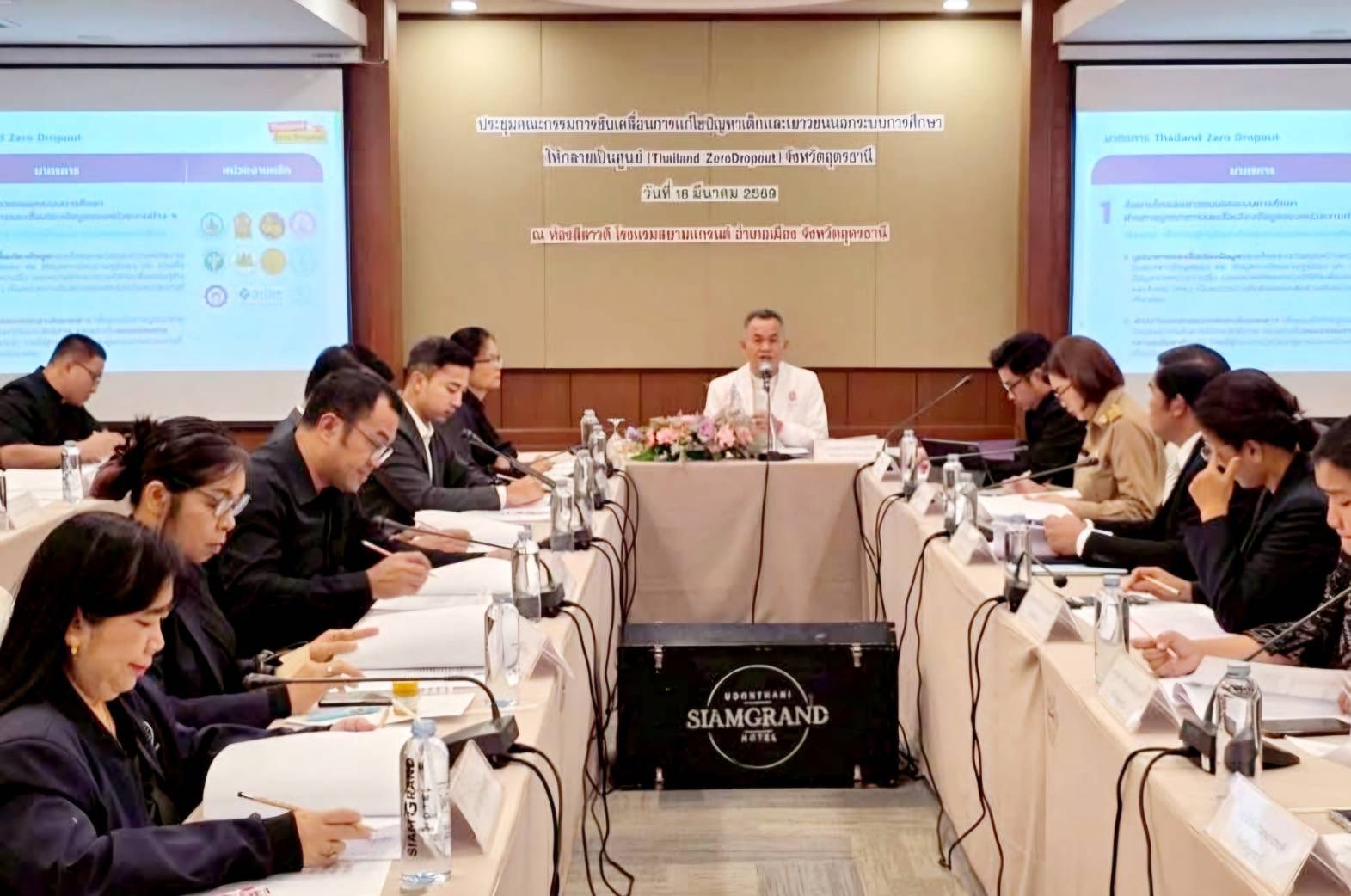วันที่ 17 มีนาคม 2569 ผู้ช่วยศาสตราจารย์ ดร.คณิศรา ธัญสุนทรสกุล อธิการบดีมหาวิทยาลัยราชภัฏอุดรธานี มอบหมายให้ผู้ช่วยศาสตราจารย์วรวัฒน์ ทิพจ้อย ผู้อำนวยการสำนักวิชาศึกษาทั่วไป เข้าร่วมการประชุมคณะกรรมการขับเคลื่อนการแก้ไขปัญหาเด็กและเยาวชนนอกระบบการศึกษา เพื่อมุ่งสู่การเป็น “Thailand Zero Dropout” ณ ห้องประชุมลีลาวดี โรงแรมสยามแกรนด์ อำเภอเมือง จังหวัดอุดรธานี การประชุมครั้งนี้ได้รับเกียรติจากนายเฉลิมชัย แสนมหาชัย ศึกษาธิการจังหวัดอุดรธานี เป็นประธาน เพื่อขับเคลื่อนนโยบายของรัฐบาลด้านการปฏิรูปการศึกษา โดยมุ่งเน้นการสร้างความเสมอภาคทางการศึกษา ส่งเสริมให้เด็กและเยาวชนได้รับโอกาสทางการศึกษา หรือพัฒนาศักยภาพตามความถนัดของตนเอง รวมทั้งสนับสนุนการสร้างรายได้ระหว่างเรียน อันจะช่วยลดความเหลื่อมล้ำทางการศึกษา และพัฒนาทรัพยากรมนุษย์ของประเทศให้มีคุณค่าในอนาคต 1 Tags: Thailand Zero Dropoutแก้ไขปัญหาเด็กและเยาวชนนอกระบบการศึกษา